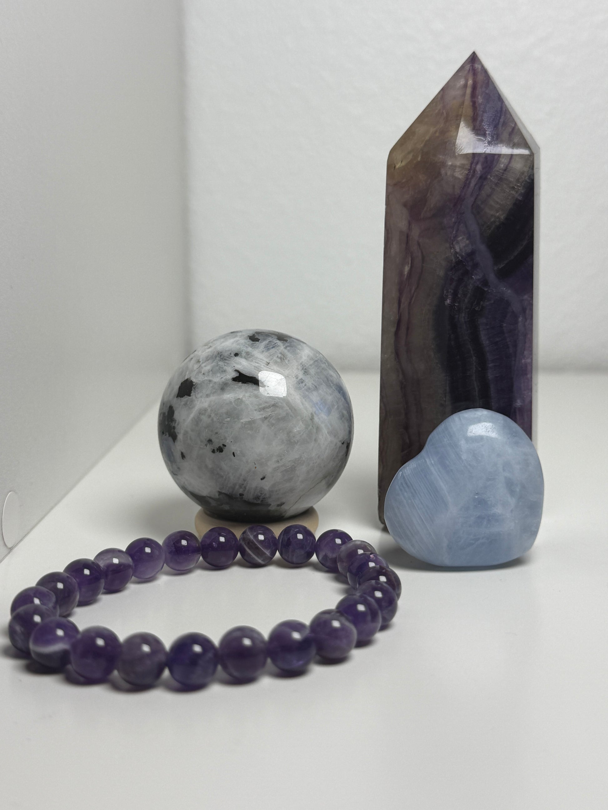 Each crystal was chosen for its calming, dreamy energy — perfect for unwinding, releasing stress and inviting peaceful, restorative sleep. Together, these crystals create a nurturing nighttime ritual that may help you: